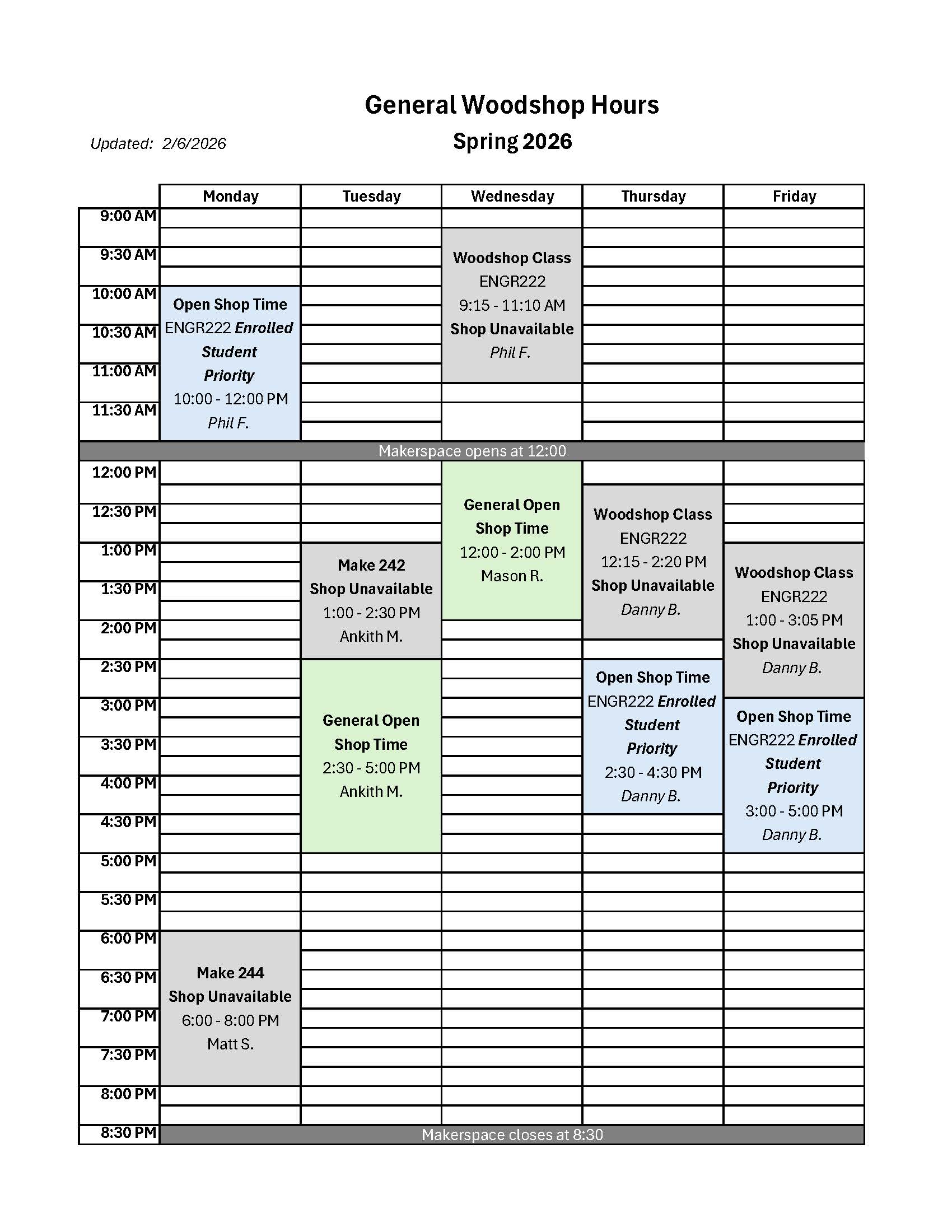 For use by students currently enrolled in ENGR 220 - Intro to Manual Machining. Others who have previously taken this course are welcome to use the equipment during this time IF the currently enrolled students are not utilizing the equipment.